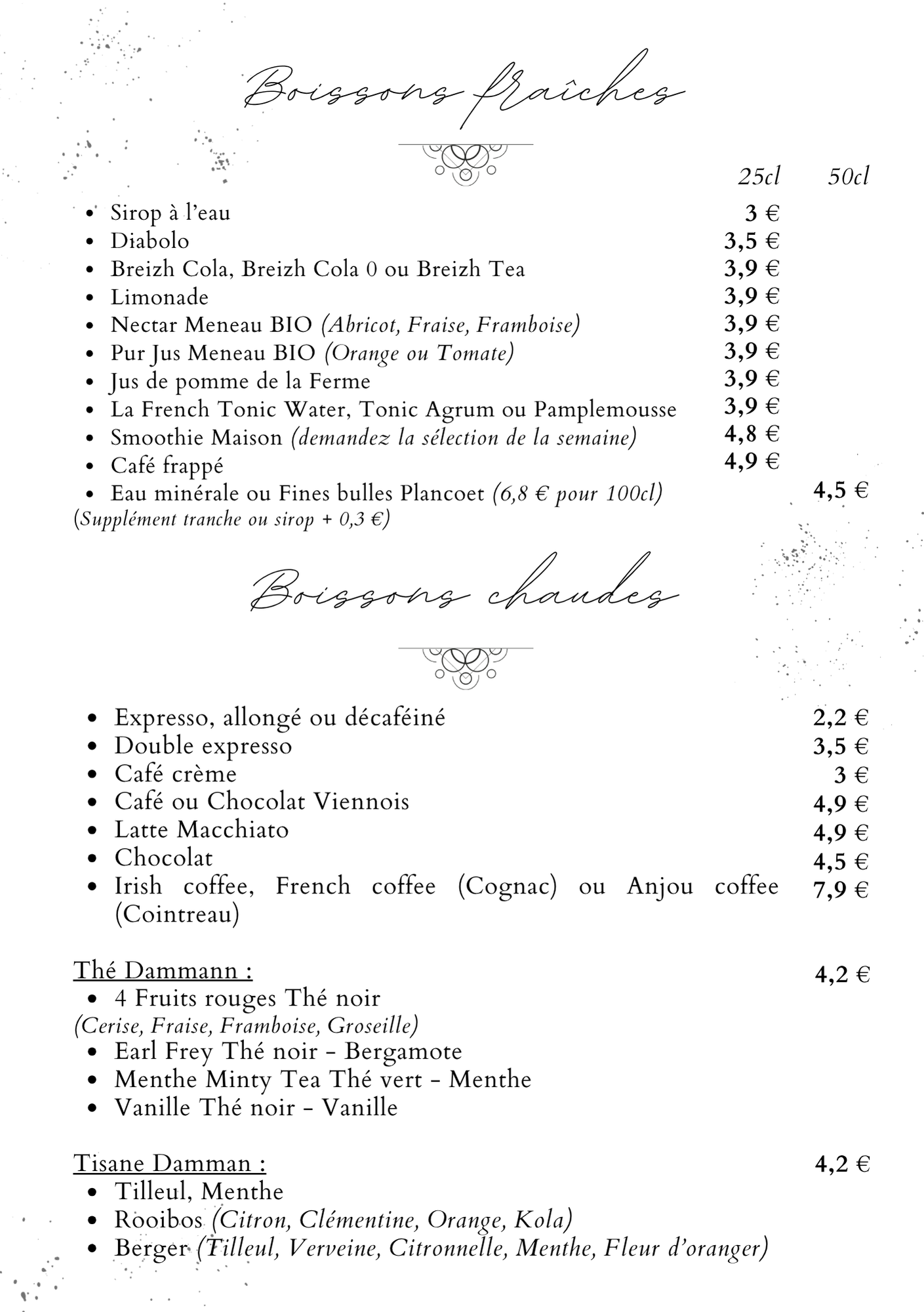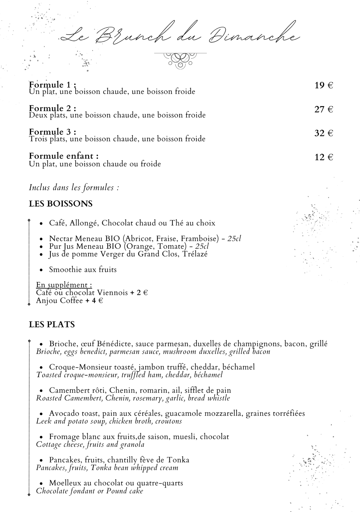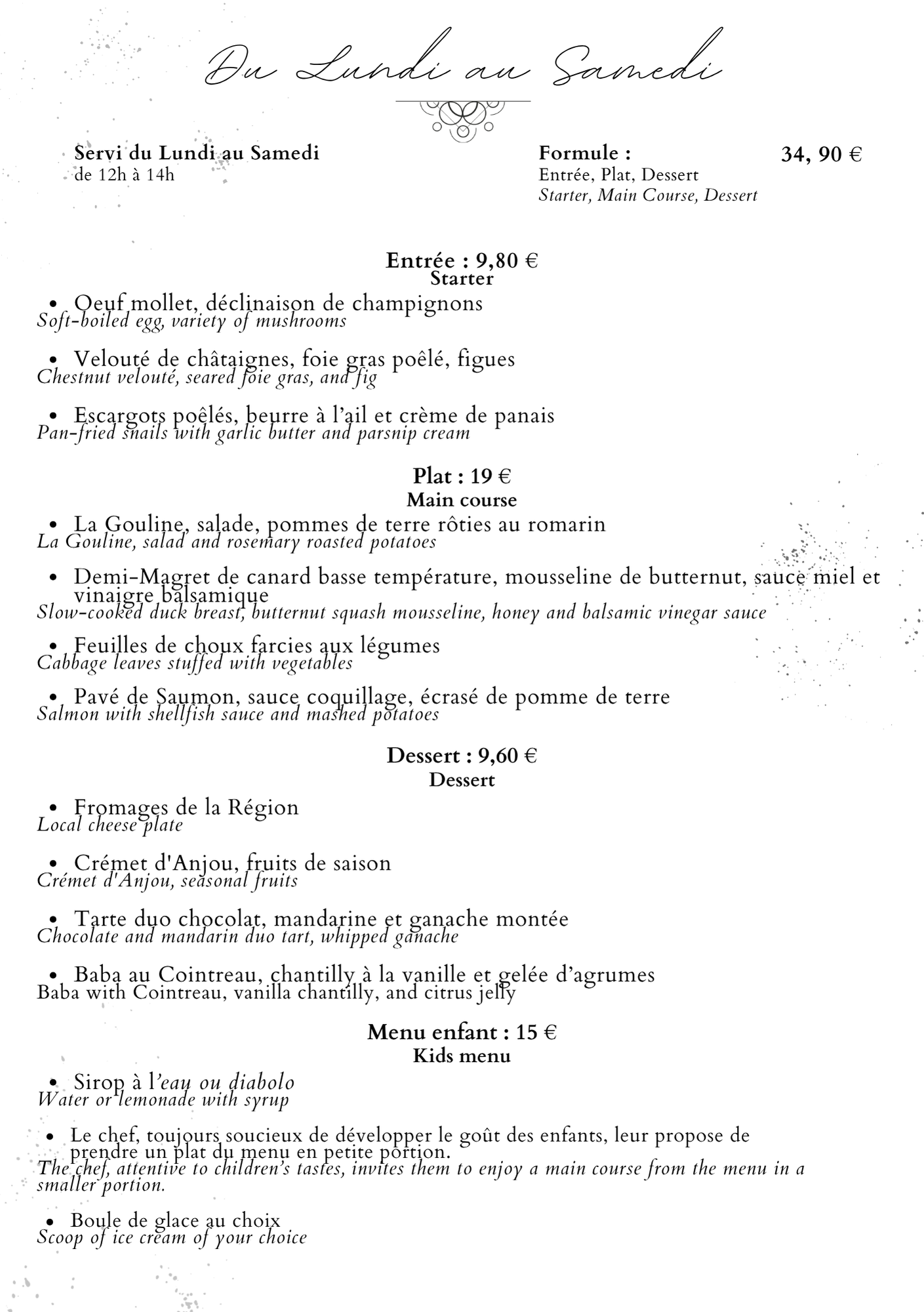 Notre restaurant propose une cuisine bistronomique française, mettant à l’honneur les spécialités de l’Anjou et les produits locaux.