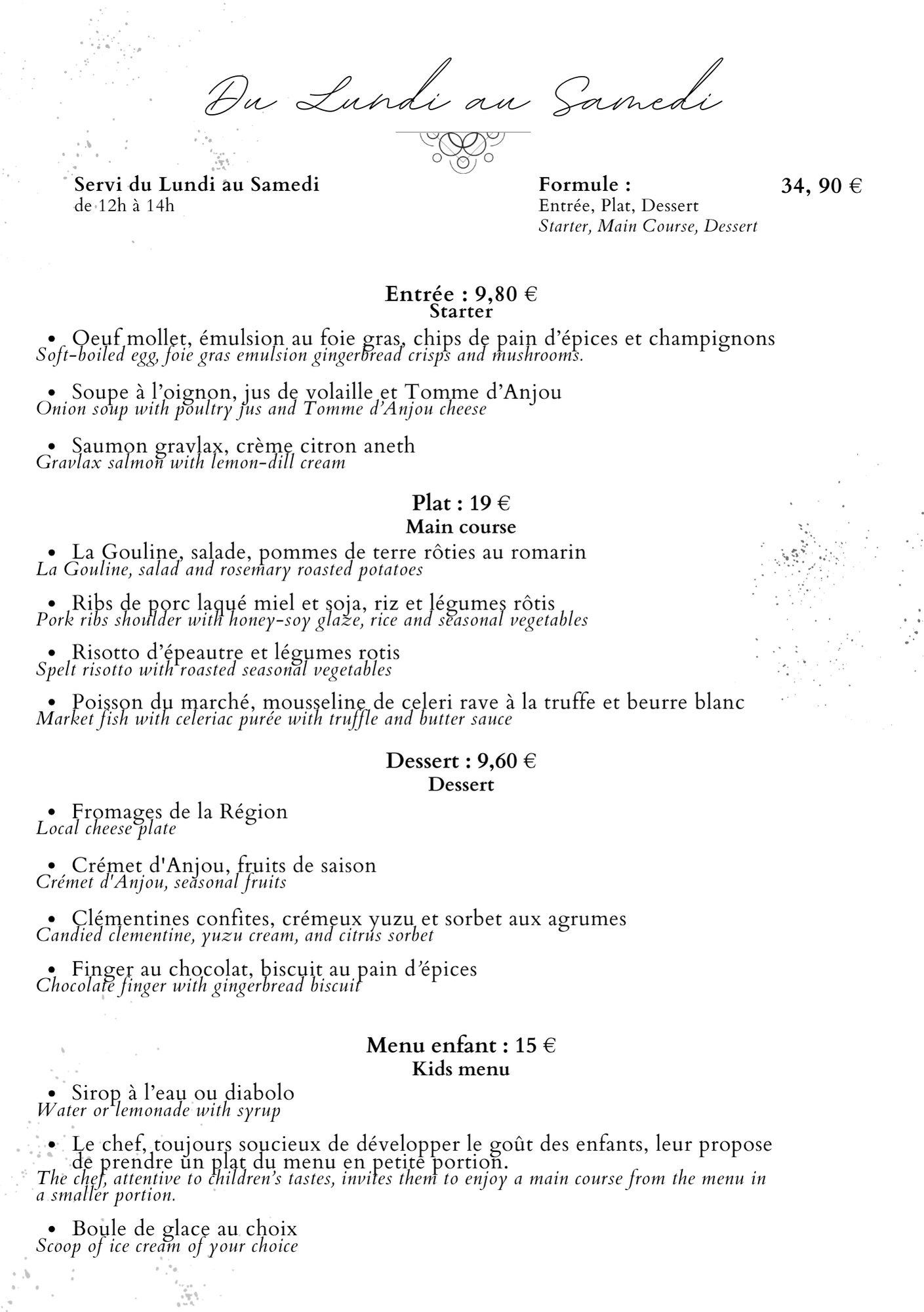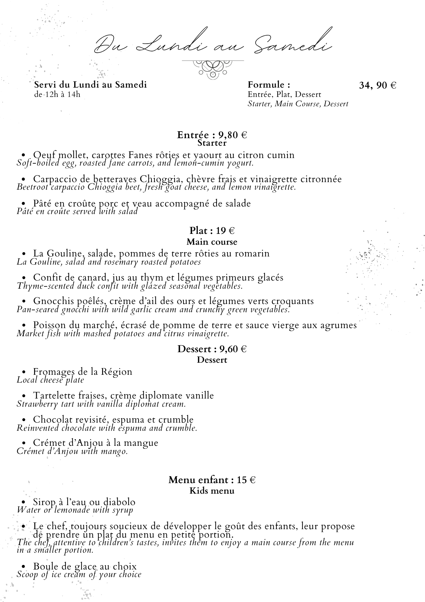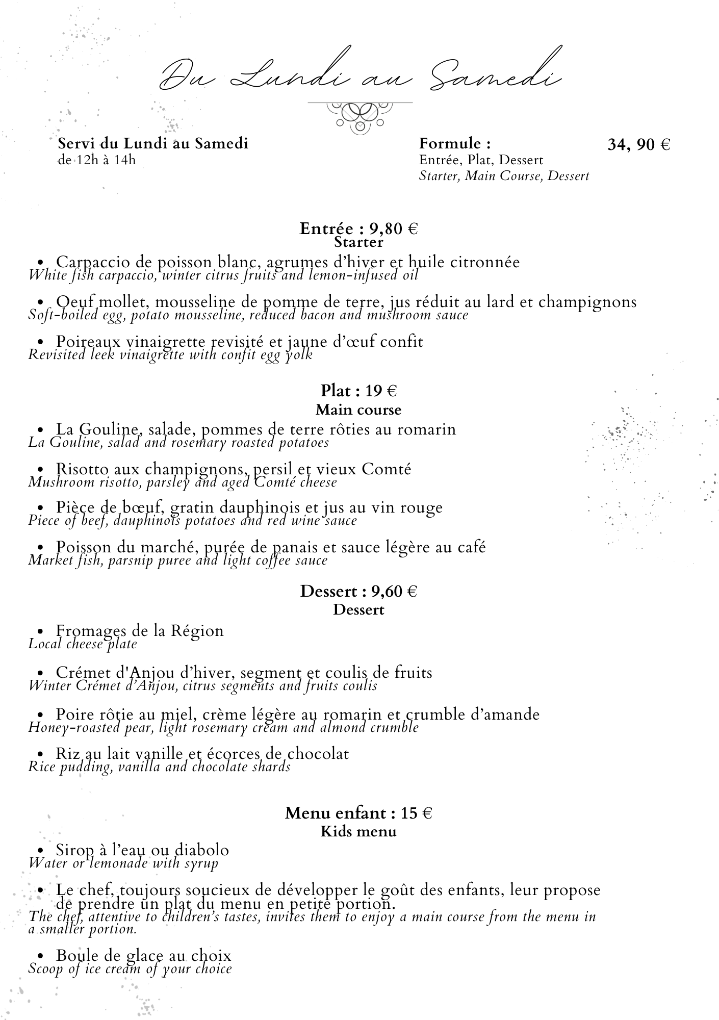 Notre restaurant propose une cuisine bistronomique française, mettant à l’honneur les spécialités de l’Anjou et les produits locaux.